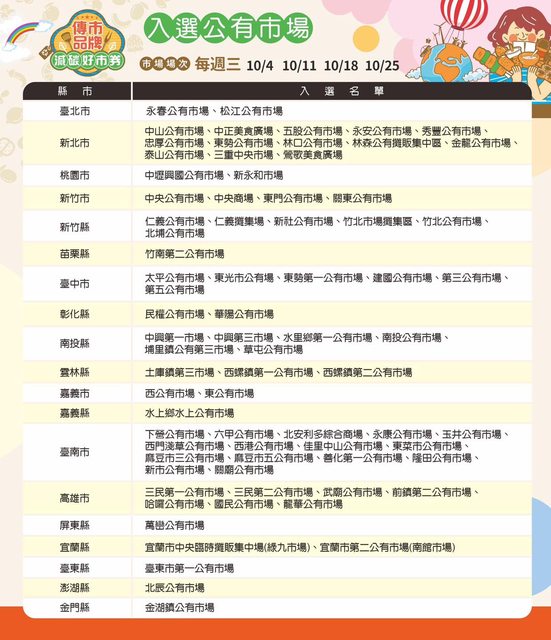 夜市及黃昏市集場次:10月每週六(10/7、10/14、10/21、10/28)發放。