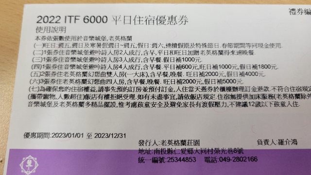 (六)3張劵住幻想曲四人房,含早晚餐,旺日補2000元,假日加5000元