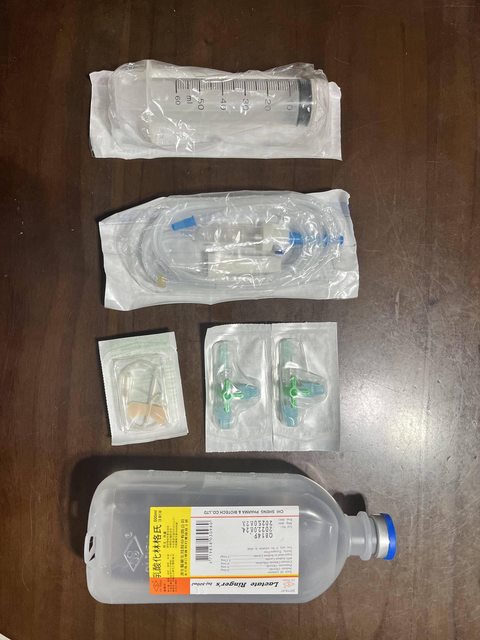 1. 居家輸液用品,林格氏液/針筒/蝴蝶針…等,林格氏液一瓶,其餘少許。