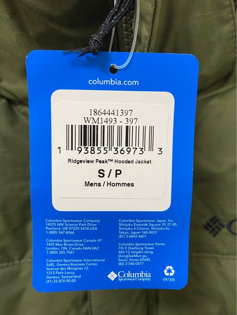 出售物品2: 全新男款Columbia Ridgeview Peak防水化纖保暖外套 - S號 軍綠色 售價:3300