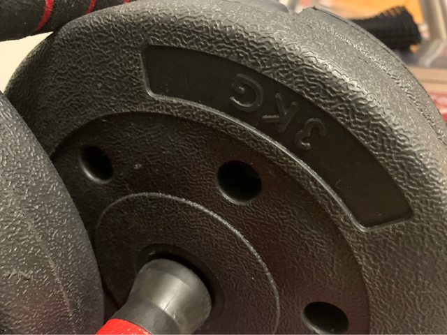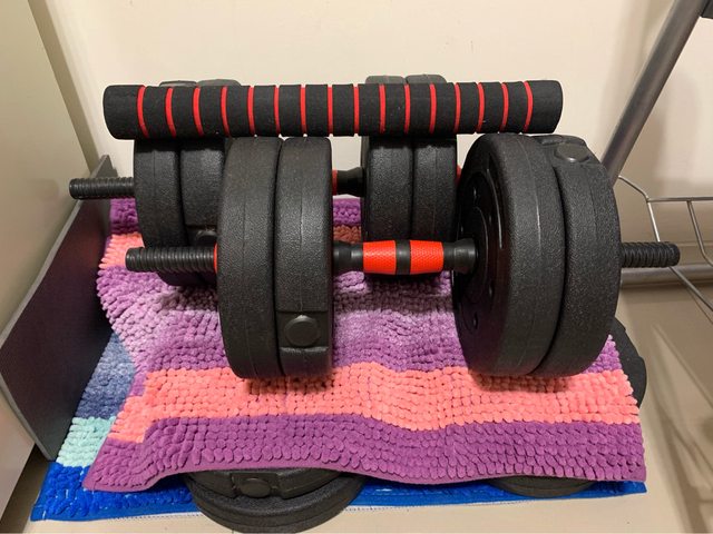 環保錏鈴二支,錏鈴片16片,單片3kg,附桿鈴桿一支。