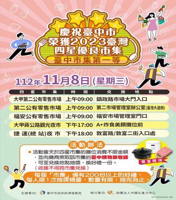 為慶祝台中市今年新增5處四星優良市集,特別辦理高星等市集消費抽獎活動。