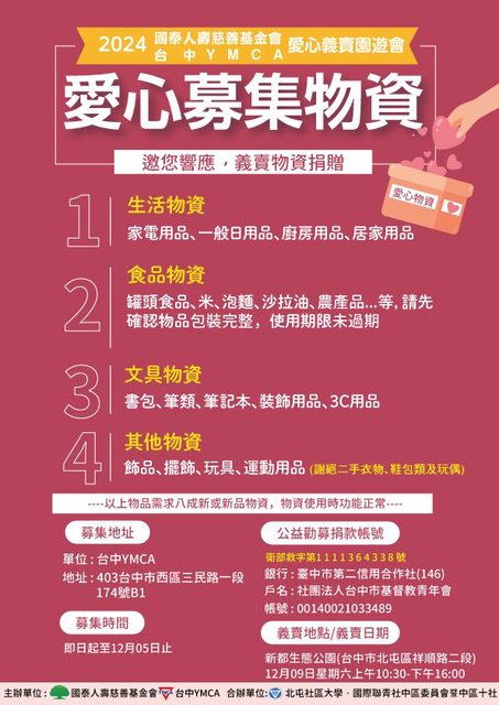 募集方式: 請將義賣品妥善包裝好後寄送至YMCA三民會館 (台中市西區三民路一段174號B1