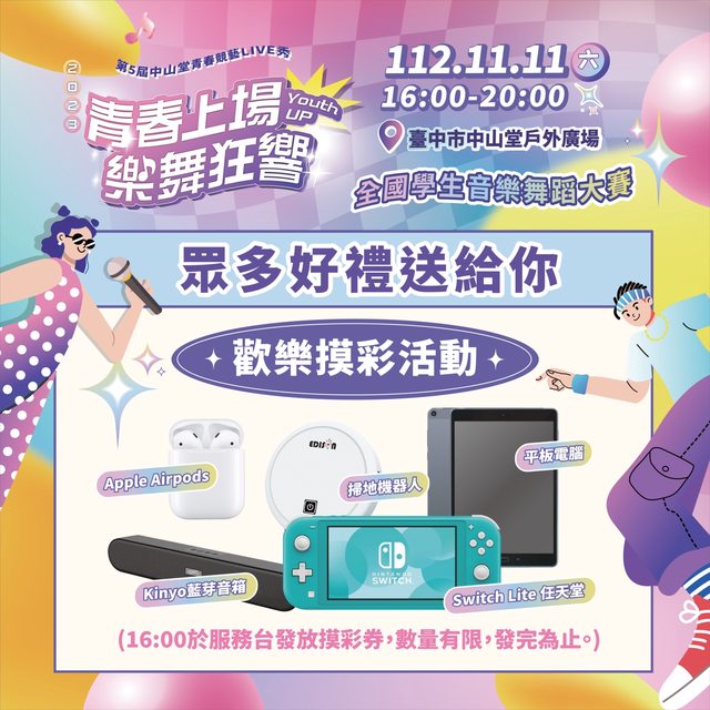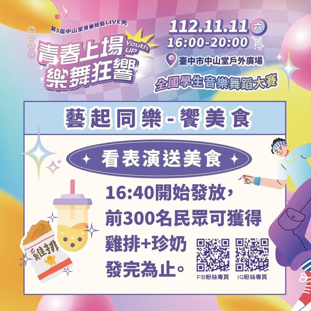 中山堂青春競藝LIVE秀11/11決戰台中 限量雞排、珍奶免費送