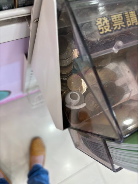 看到旁邊的零錢箱裡有一支無線耳機,但看起來又好像只有殼沒有耳機的那些元件(?)