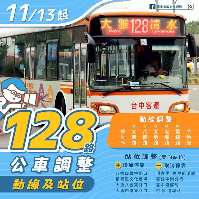 11/13(一)起 #128路公車 調整行駛動線及站位‼
