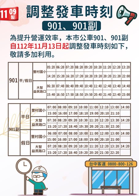 901、901副公車自112年11月13日起調整發車時刻
