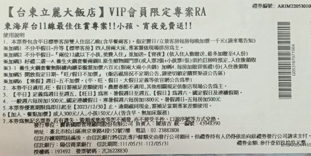 台東立麗大飯店住宿券含早餐1張3000元
