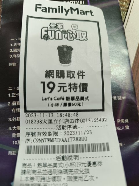 標題[贈送] 全家小單品美式19元券