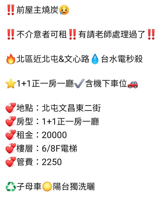 jkl4566654 : 目前西屯華夏46坪含機械車位可貓 租房客20k+管2k 感 12/02 23:17