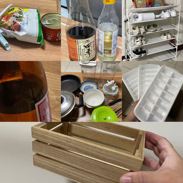 物品名稱:太白粉/鯖魚罐頭/醬油/白醋/不織布五層鞋櫃/米酒/湯鍋/碗盤餐具/食物保存