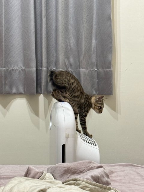 喜喜個性膽小,動作大一點就會原地起飛,需要多花一些時間培養感情。也超級親貓,會