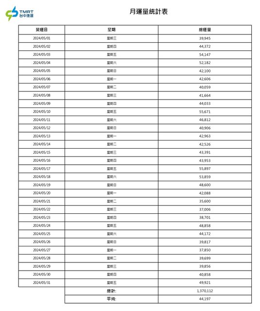 標題Fw: [情報] 台中捷運113年5月各站旅運量