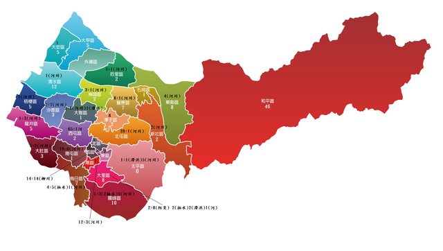以太平來舉例,白色數字是0個、黑色數字是1+1(滯洪池)+5(支線河川)=7個