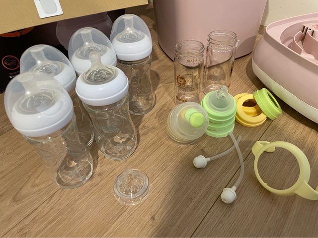 2.avent玻璃奶瓶五支,贈送前會取下奶嘴頭,少一蓋子/兩隻獅王玻璃奶瓶 瓶蓋數個如