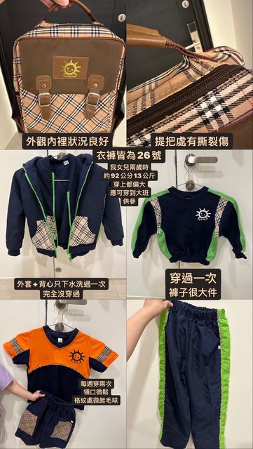 物品名稱:太和幼兒園書包、制服(冬夏各一套+背心+外套,26號)
