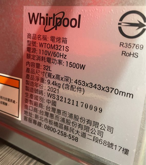 物品:惠而浦 32公升不鏽鋼機械式烤箱