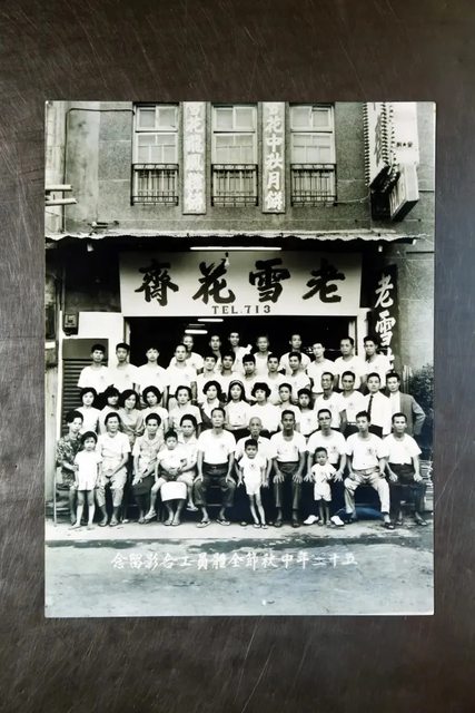 ▲半世紀前的老雪花齋,創辦人呂水(中坐長者)與全體員工於中秋節合影。(圖/呂松