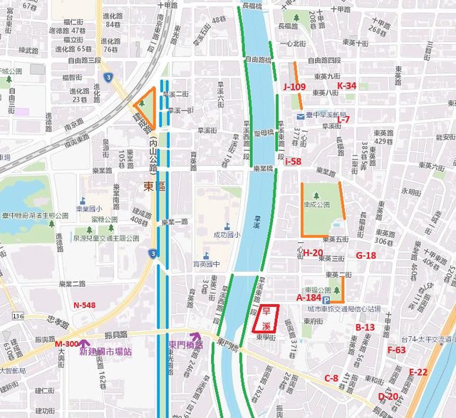 ※N.俥亭-台中建國市場停車場 + 公車(51、59、280、286、289)(新建國市場站到東門橋