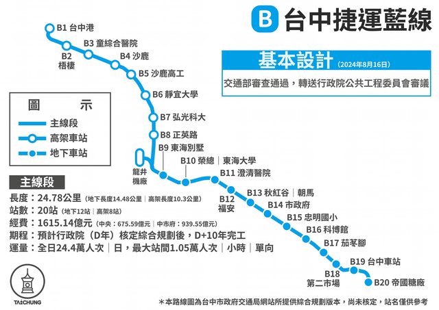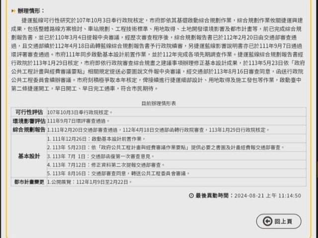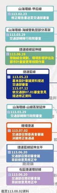 113.08.16 藍線:基本設計歷經兩次審查及一次修正後,獲交通部審查同意,目前已轉送