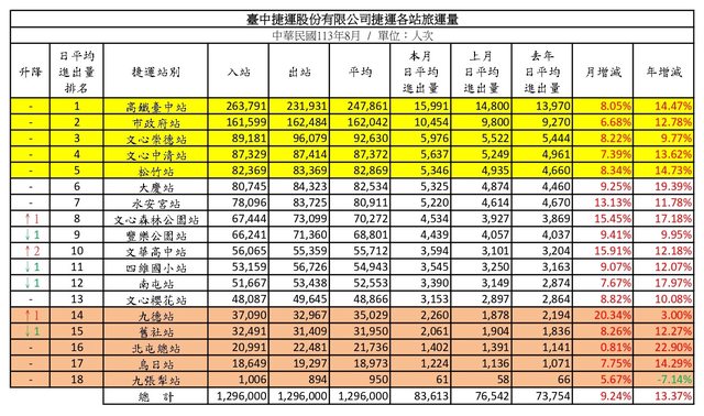 標題: [情報] 台中捷運113年8月各站旅運量