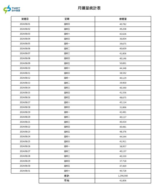 標題Fw: [情報] 台中捷運113年8月各站旅運量