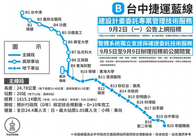 另該線土建標工程將預定分為四到五個標案分區動工,並以龍井機廠(列車維修保養廠、