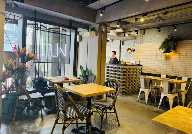 翠綠植栽與微黃燈串點綴水泥磚造工業風牆面,藤椅木桌與復古鐵椅交錯,沒有工業風的
