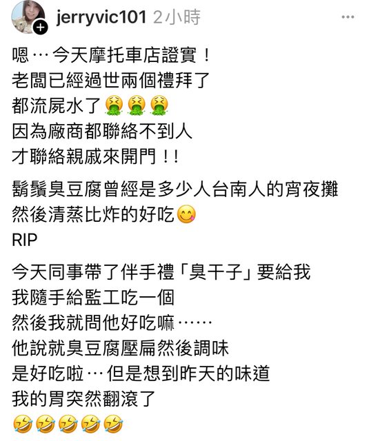 我剛剛滑脆看到的 鬍鬚臭豆腐老闆在店內死了兩週才被發現 真是阿彌陀佛 祝他一路好走 https://i.imgur.com/MmtrCNM.jpeg