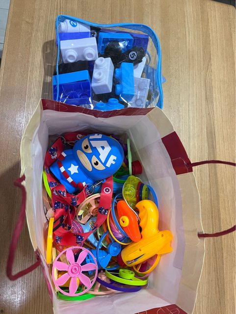 交易物品/金額/說明:小孩玩具,有積木跟一堆陀螺(夜市玩具)、一個小背袋