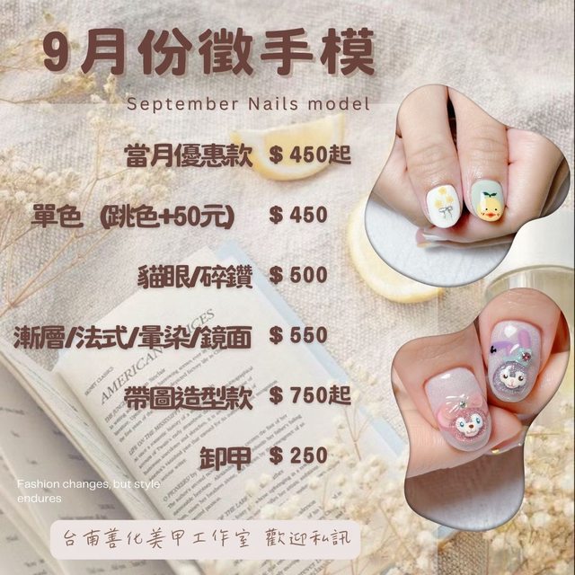 2.加line預約輸入「9月手模」可享當次美甲折價$50