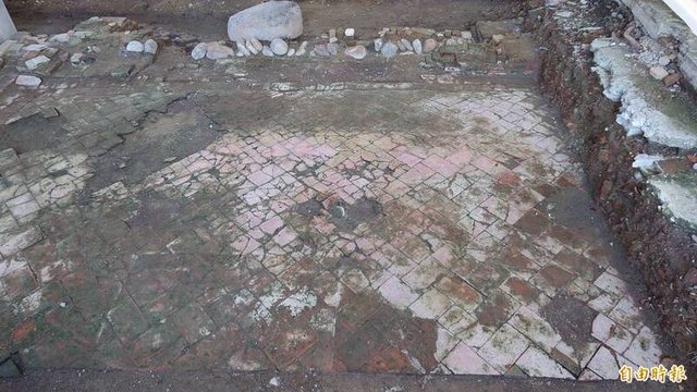 清治時期地層發掘出的紅磚鋪面遺構,吻合金門閩南建築的米篩花式地坪特徵,考古研究