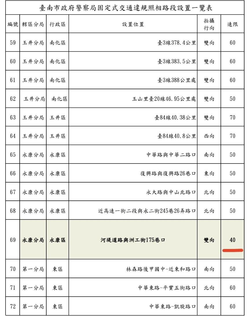 → mw221c: 剛剛查了台南市警察局固定式交通違規照相路段,河堤道路與 09/27 21:24