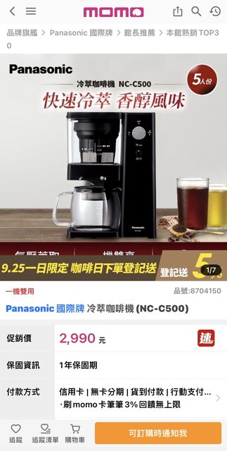 2. (售出)全新國際Panasonic冷萃咖啡機