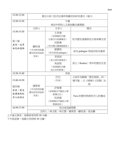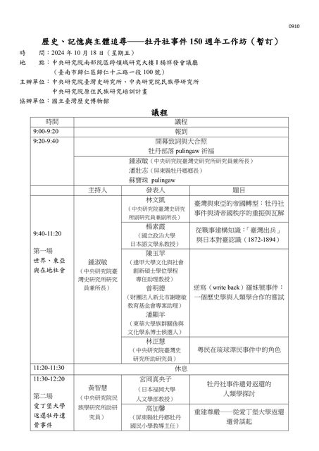 標題[活動] 「歷史、記憶與主體追尋──牡丹社事件150週年」工作坊