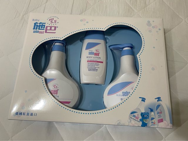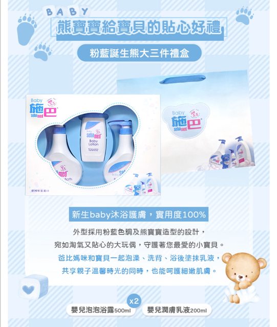 3、施巴-嬰兒粉藍誕生熊大三件禮盒(全新附提袋)