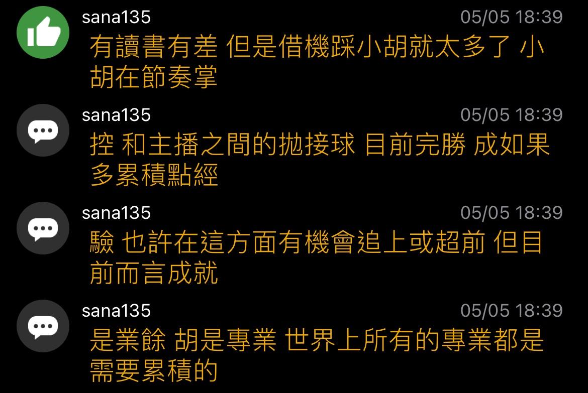 → sana135 : 是業餘 胡是專業 世界上所有的專業都是需要累積的 05/05 18:39
