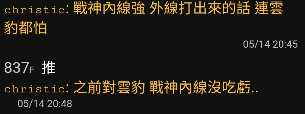 → christic : 戰神內線強 ..我有說比雲豹強嗎..而且事實上上次戰 05/14 22:39