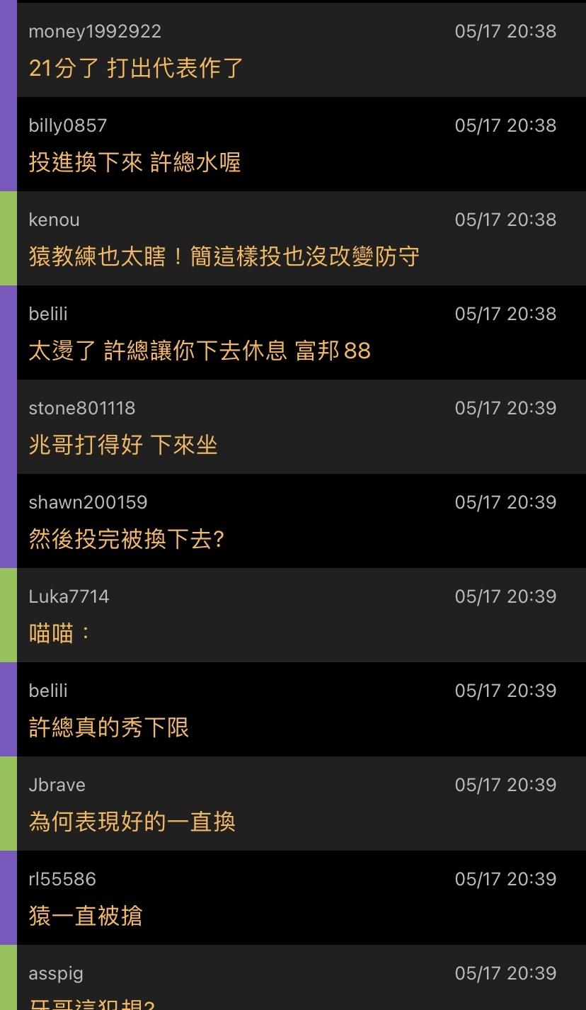 → sunlucky : 簡那場第四節剩5分下去 2分半上來 這樣有問題? 05/19 01:10