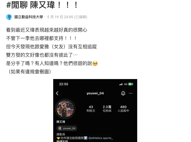 推 kakashi777 : 大學劈腿籃球甜心 現在又劈腿 又瑋好壞喔 06/12 11:11
