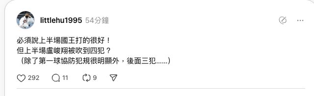 必須說上半場國王打的很好! 但上半場盧峻翔被吹到四犯? (除了第一球協防犯規很明顯外,後面三犯……) 備註 小胡好像預測領航猿 4:3 班表Game 6 (6/22) -- ※ 發信站: 批踢踢實業坊(ptt-site.org.tw), 來自: 111.248.220.164 (臺灣) ※ 文章網址: https://ptt-site.org.tw/basketballTW/M.1718889397.A.88C