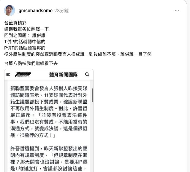 推 zxcvb98512 : 富邦黑人沒話語權代表P被T併掉了 走回籃邪老路了 07/03 13:07
