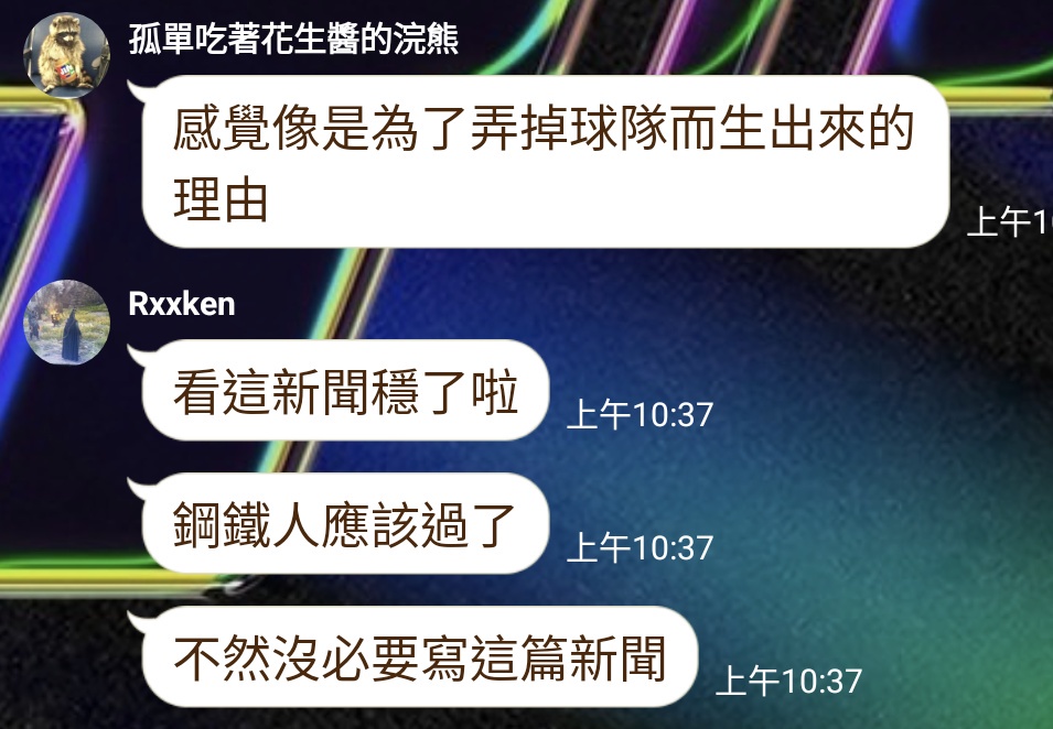 → wish8042 : 沒有能力影響這隻具備爭議的球隊,鋼鐵人出局純屬P 07/06 09:24