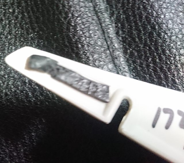 下巴中間白色區塊的最上緣,明顯的黑漆溢出。