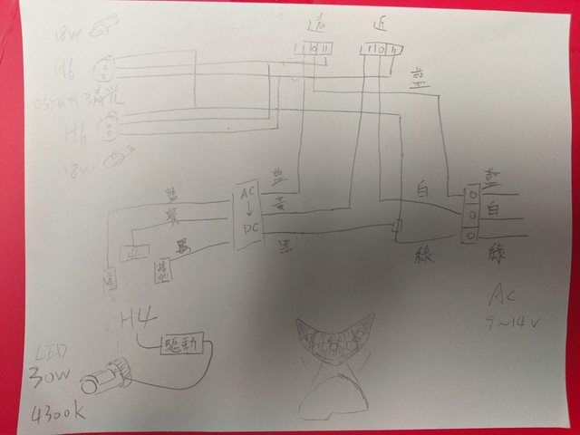原本是將鹵素大燈換成h6的毛毛蟲魚眼(近黃遠白),且在燈座下半圈墊上水管橡皮墊片,