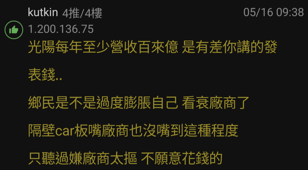 推 soulllful: 光陽都請公關公司在這搞風向了,怎麼可 42.77.176.231 05/17 02:49