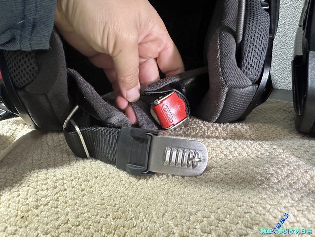 頤帶部分是採用塑膠插扣,要脫安全帽、解插扣時只要拉下紅色拉繩就可以解開。