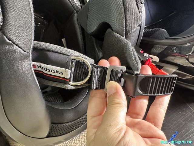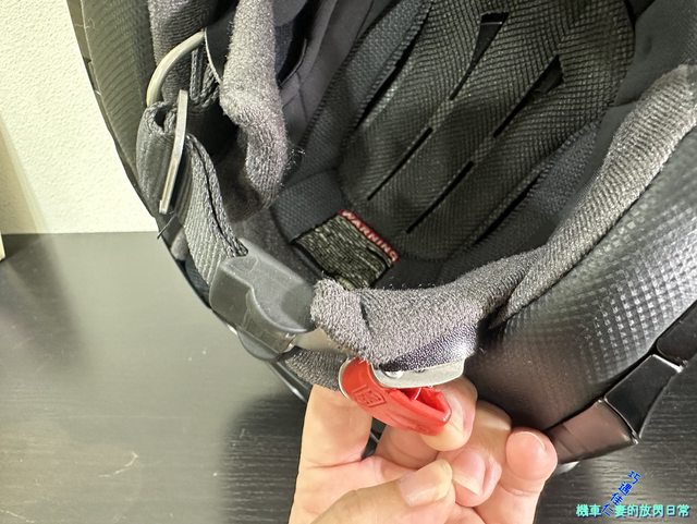 Shoei J-Cruise II是金屬插扣,脫安全帽、解插扣需下撥紅色撥片,