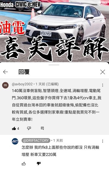 推 ymx3xc : 他就本田粉 開FK8,你不喜歡退訂就好. 07/24 21:53
