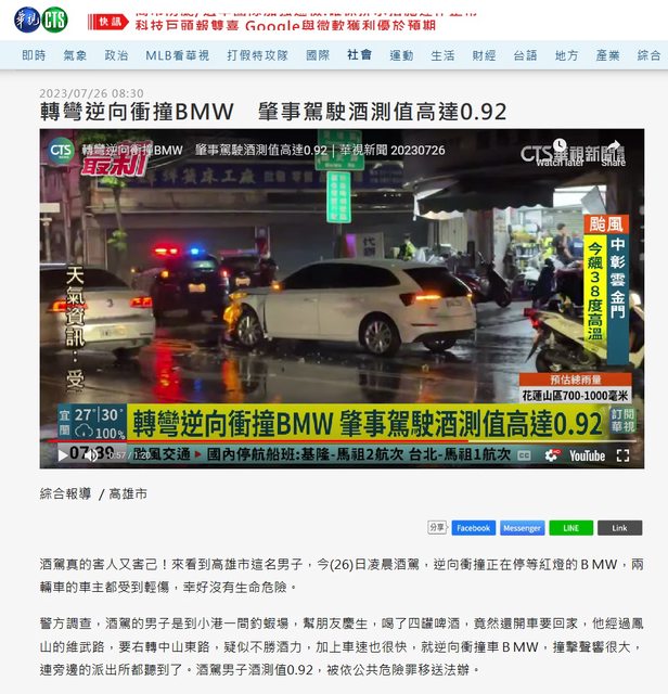 標題[新聞] 轉彎逆向衝撞BMW 肇事駕駛酒測值高達0.92